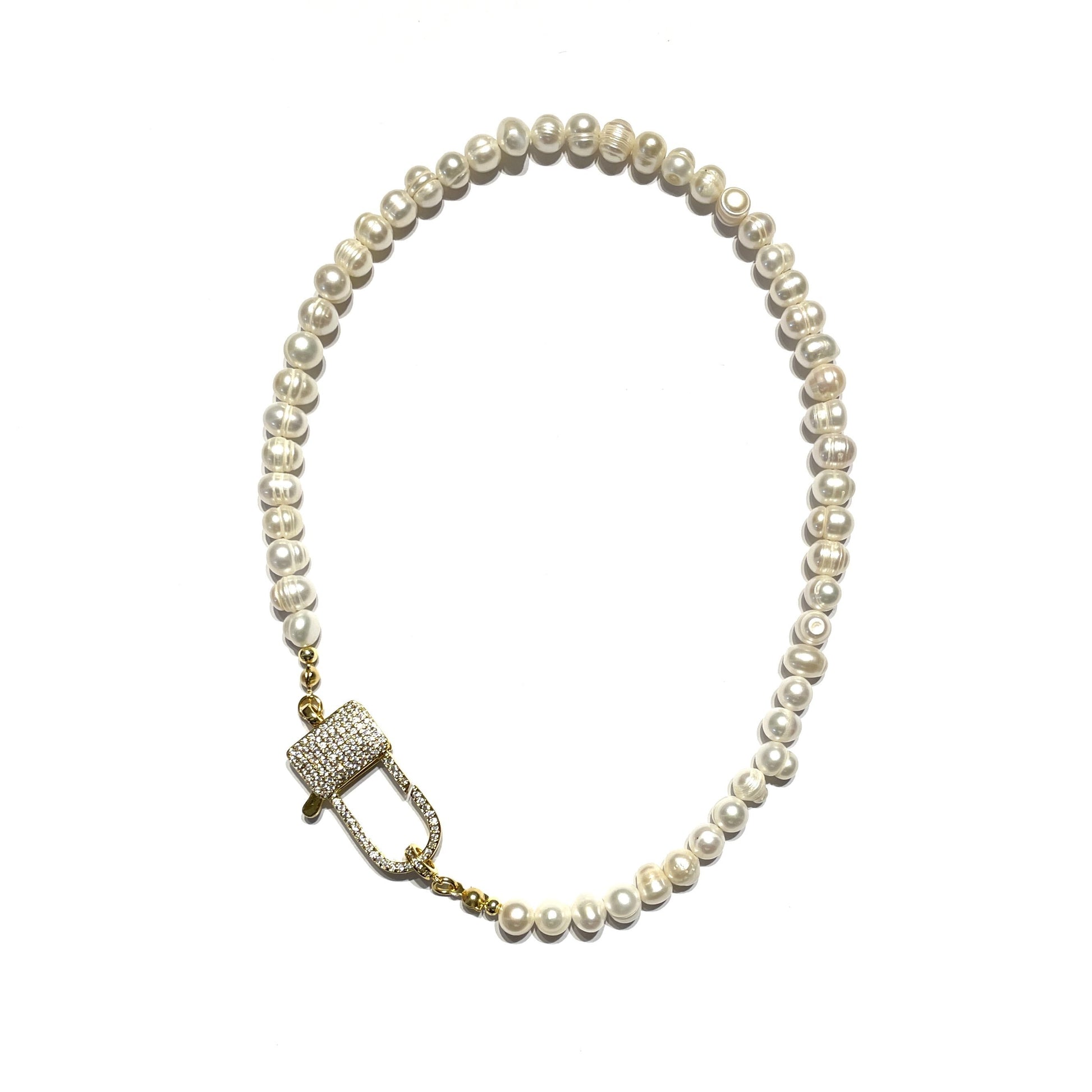 Collar en perlas cultivadas con cerradura en baño de oro 18k con detalles en zirconia cúbica .