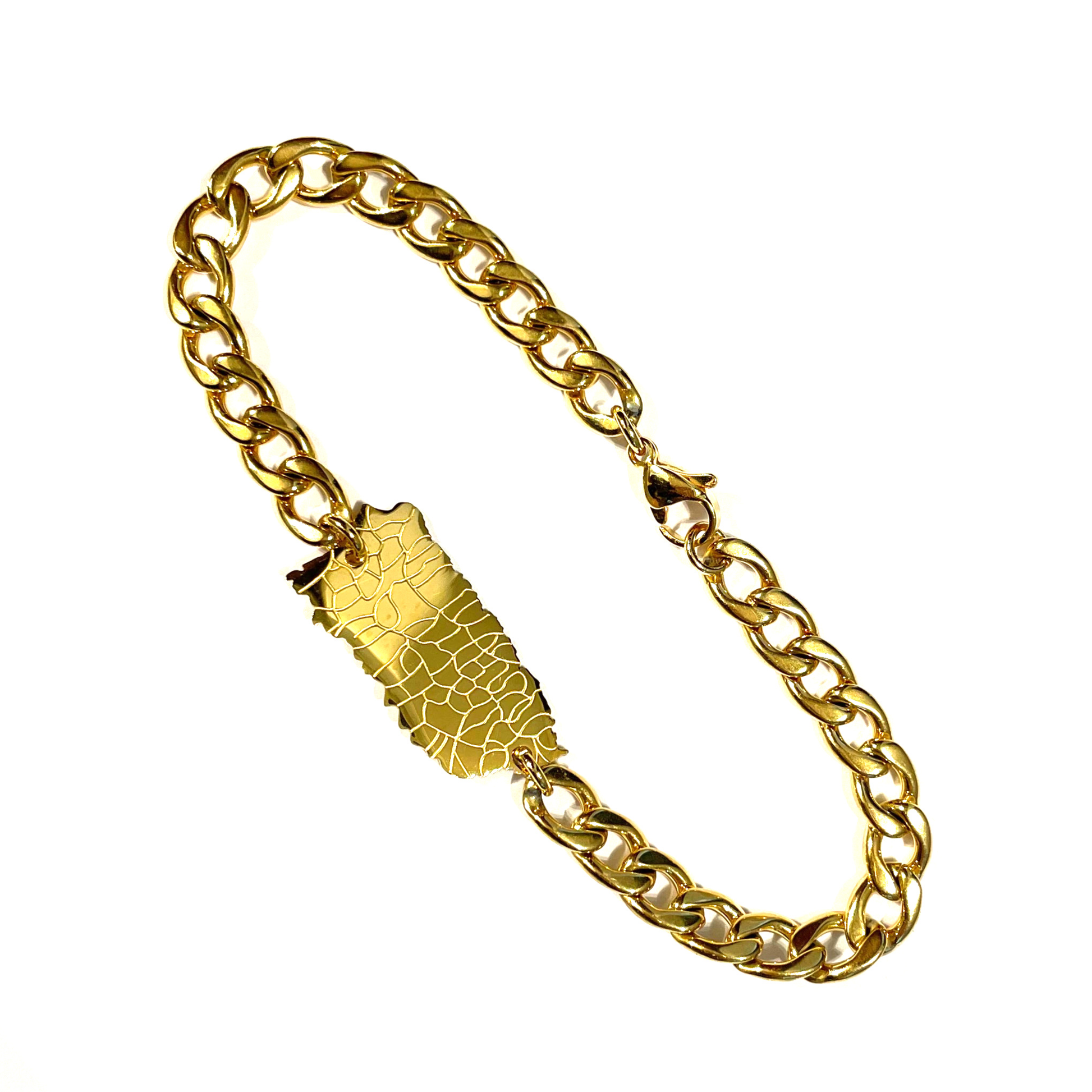 Pulsera en acero inoxidable (Stainless Steel) dorado con el mapa de Puerto Rico.